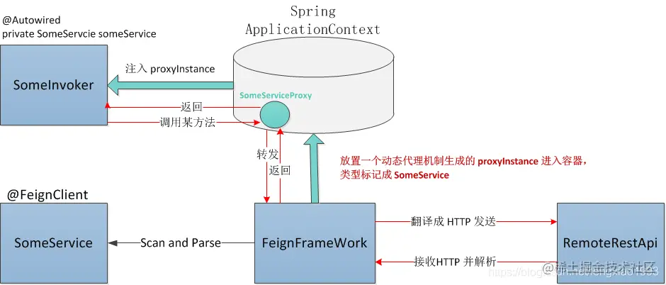 @FeignClient修饰类后,Feign框架通过扩展Spring Bean Deifinition的注册逻辑, 最终注册一个FeignClientFacotoryBean进入 Spring 容器 - Spring 容器在初始化其他用到