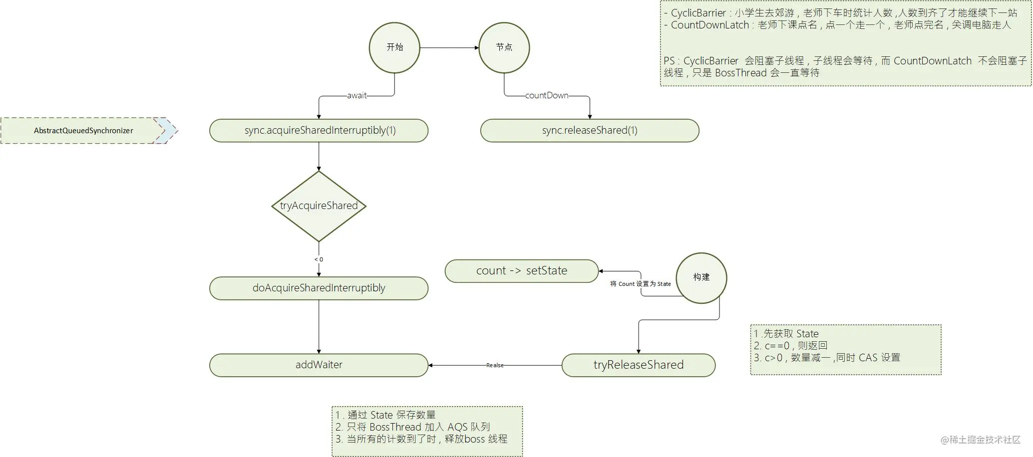 总结 CountDownLatch 内部通过共享锁实现。在创建CountDownLatch实例时,需要传递一个int型的参数:count,该参数为计数器的初始值,也可以理解为该共享锁可以获取的总次数。