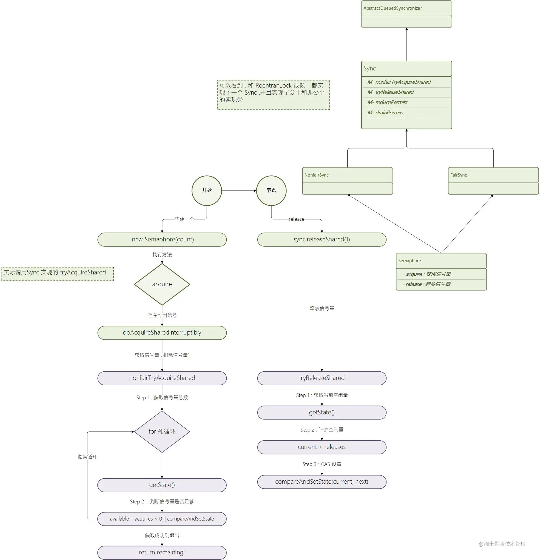 当一个线程想要访问某个共享资源时,它必须要先获取Semaphore,当Semaphore >0时,获取该资源并使Semaphore – 1。如果Semaphore值 = 0,则表示全部的共享资源已经被其他线程全部占用,线程必须要等待其他线程释放资源。当线程释放资源时,Semaphore则+1