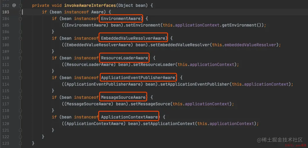可以看到,该类用于执行各种驱动接口,在bean实例化之后,属性填充之后,通过执行以上红框标出的扩展接口,来获取对应容器的变量。所以这里应该来说是有6个扩展点 ,这里就放一起来说了