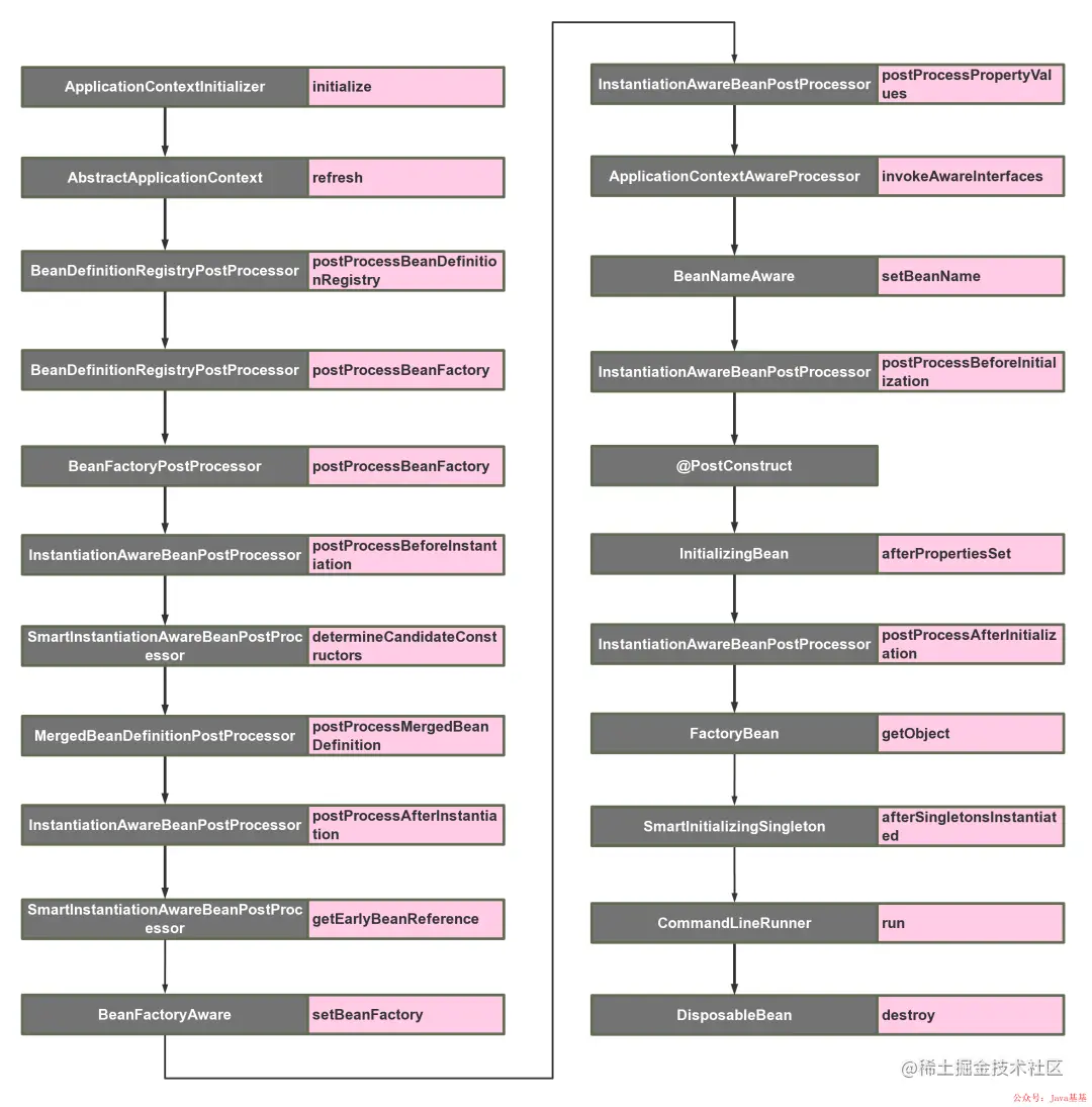 所以在这篇文章里,我总结了几乎Spring & Springboot所有的扩展接口,以及各个扩展点的使用场景。并且整理出了一个bean在spring内部从被加载到最后初始化完成所有可扩展点的顺序调用图。从而我们也能窥探到bean是如何一步步加载到spring容器中的。