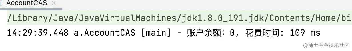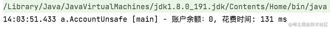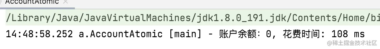 log.info("账户余额:{}, 花费时间: {}", account.getBalance(), (end-start)/1000_000 + " ms");