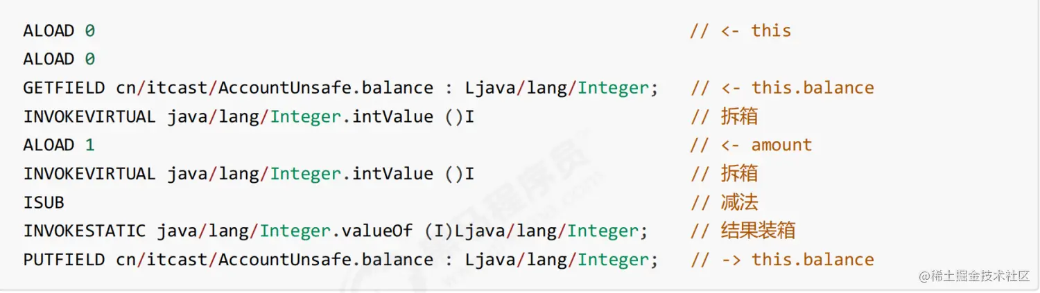 原因也很简单,取钱方法withdraw()的操作balance -= amount;看着就一行代码,实际上会生成多条指令,如下图所示: