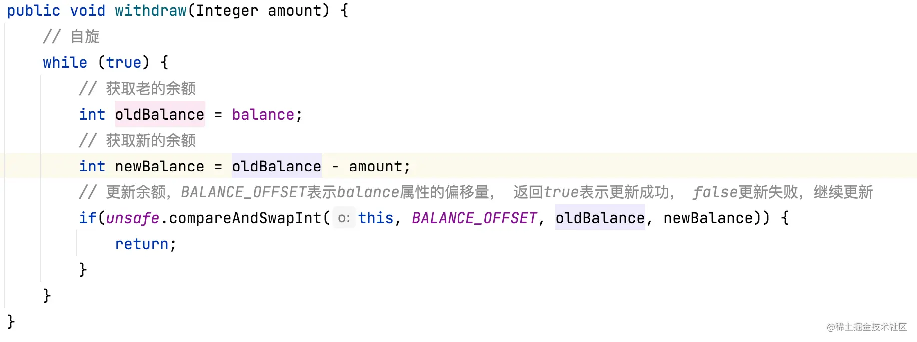 unsafe.compareAndSwapInt()方法,如果内存中余额属性的偏移量BALANCE_OFFSET对应的值等于老的余额,说明的确没有被其他线程访问修改过,我就大胆的更新为newBalance,退出方法 - 否则的话,我就要进入下一次循环,重新获取余额计算。