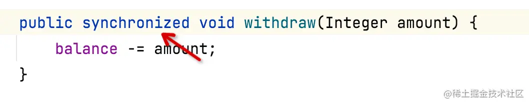 最简单的方法,我想大家都能想到吧,给withdraw()方法加锁,保证同一时刻只有一个线程能够执行这个方法,保证了原子性。