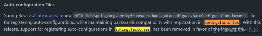 通用格式是:接口(或者注解)全类名=\接口实现类(或者使用了该注解的类)全类名-1,\接口实现类(或者使用了该注解的类)全类名-2,\...接口实现类(或者使用了该注解的类)全类名-n。spring.factories中最常用的注解是org.springframework.boot.autoconfigure.EnableAutoConfiguration,通过配置此注解对应的实现了,底层会由AutoConfigurationImportSelector对响应的目标类进行加载和自动注册。通过阅读Spring Boot 3.0 Migration Guide得知,spring.factories功能在Spring Boot 2.7已经废弃,并且会在Spring Boot 3.0移除。