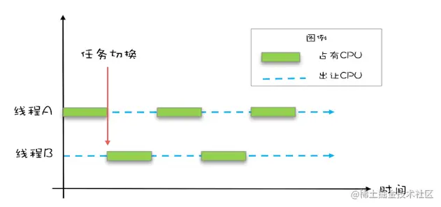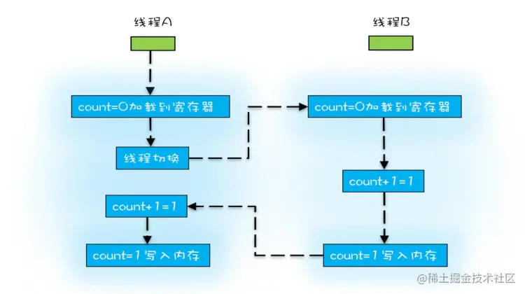 操作系统做任务切换,可以发生在任何一条CPU 指令执行完。假设 count=0,如果线程 A 在指令 1 执行完后做线程切换,线程 A 和线程 B 按照下图的序列执行,那么我们会发现两个线程都执行了 count+=1 的操作,但是得到的结果不是我们期望的 2,而是 1。