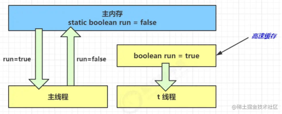 现代的CPU架构基本有多级缓存机制,t线程会将run加载到高速缓存中,然后主线程修改了主内存的值为false,导致缓存不一致,但是t线程依然是从工作内存中的高速缓存读取run的值,最终无法跳出循环。