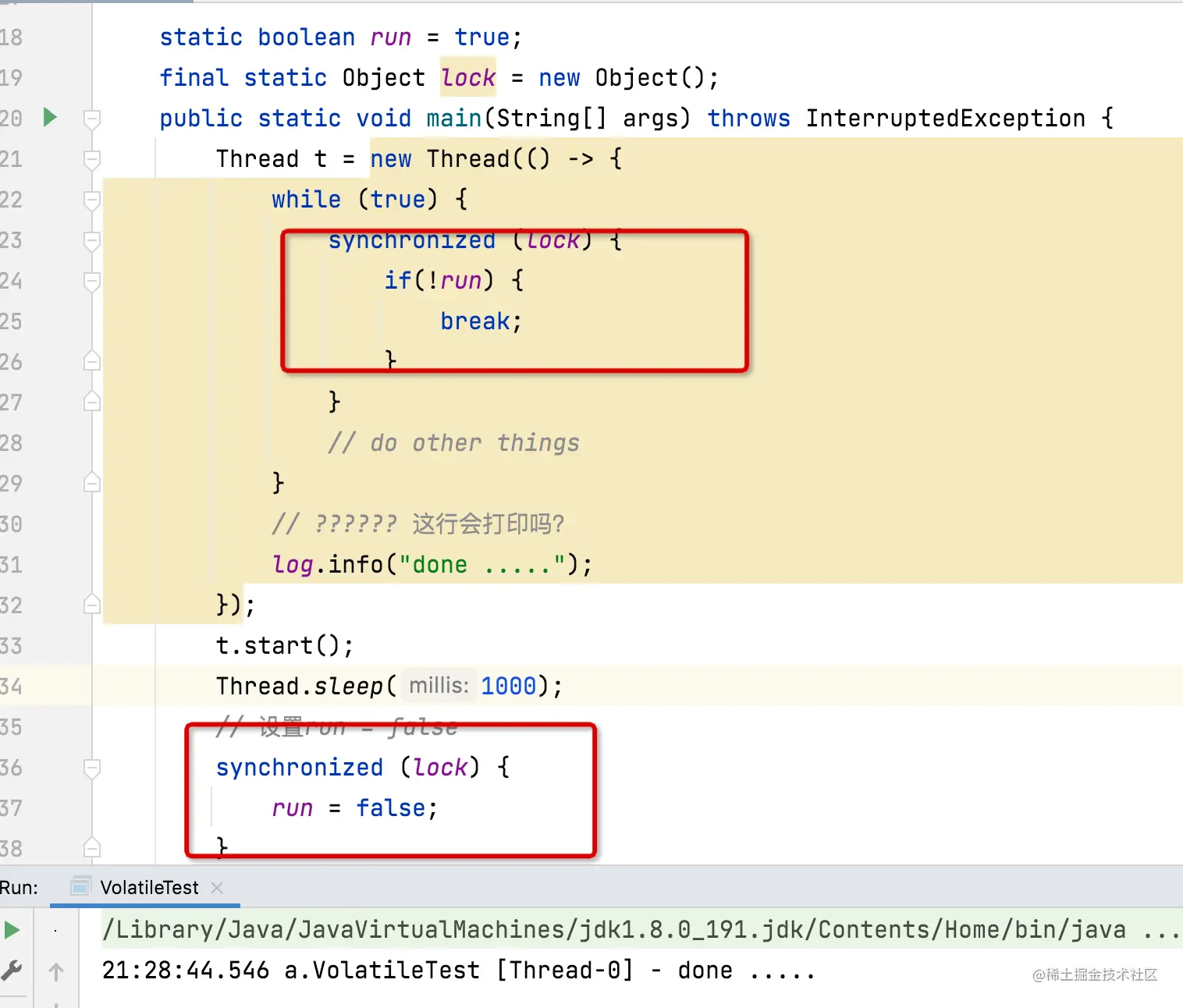 main函数中新开个线程根据标位run循环,主线程中sleep一秒,然后设置run=false,大家认为会打印"done ......."吗?