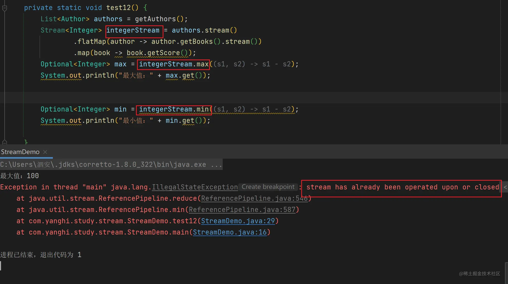- 流是一次性的(一旦一个流对象经过一个终结操作后,这个流就不能再被使用)