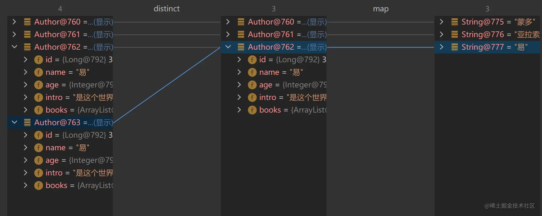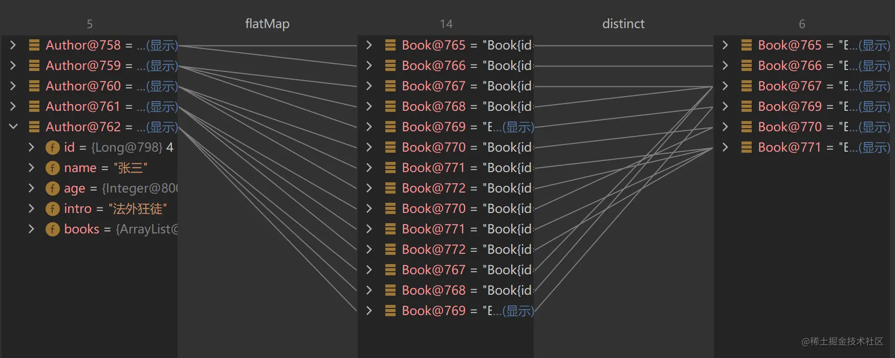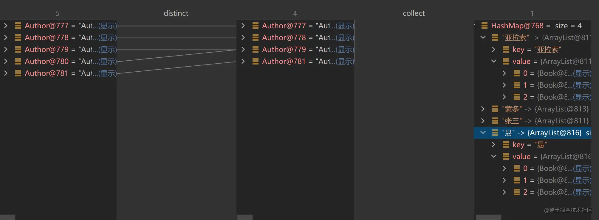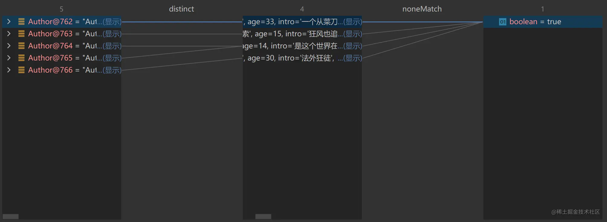 假如我们对该作家列表进行操作,要求对作家列表进行去重,并过滤年龄小于18的作家,然后依次打印作者姓名和年龄。