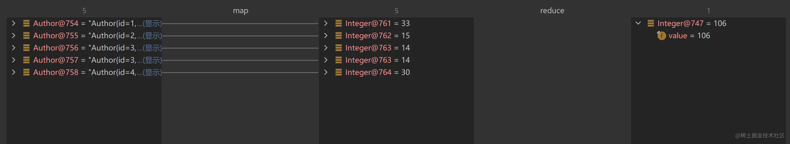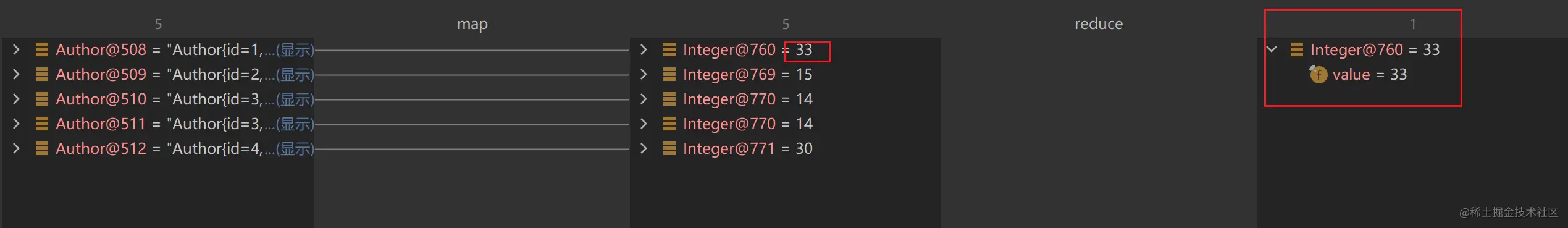 reduce 的作用就是把 stream 流中的元素组合起来,我们可以传入一个初始值,它会按照我们的计算方式依次拿流中的元素和初始值进行计算后返回结果,结果再和后面的元素计算(累加)。
