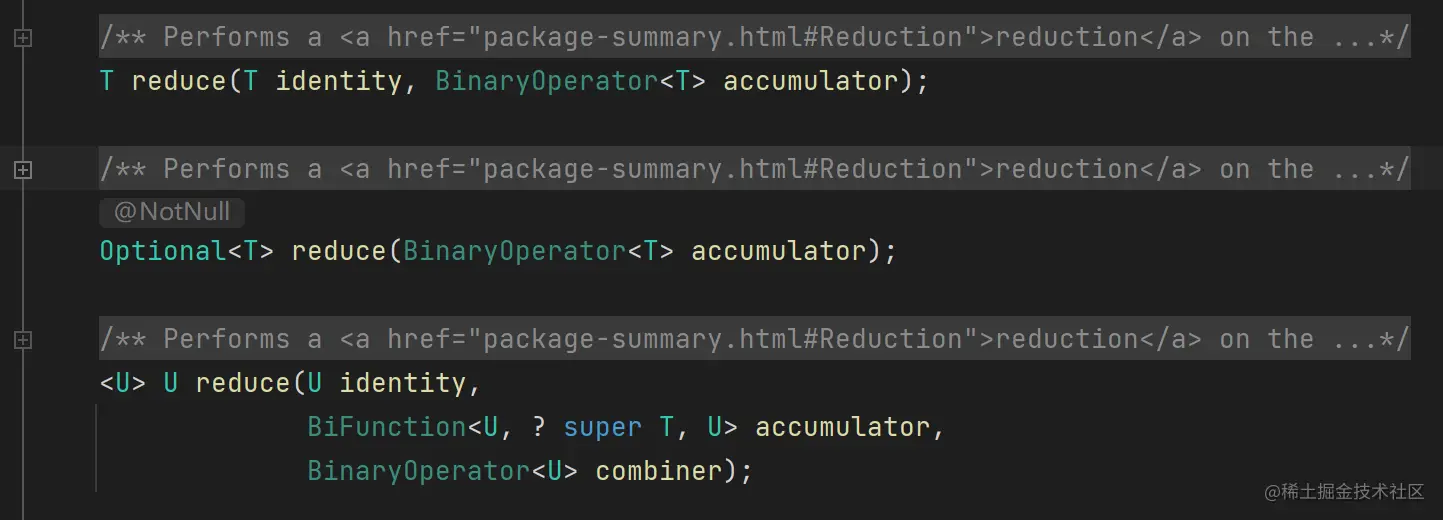 第二种重载方式,由于没有初始值,其内部会在第一次循环时,对 foundAny 进行判断,满足将stream 流中的第一个元素,赋值给初始值,然后进行循环计算。这种方式适用于与自身进行一些运算。