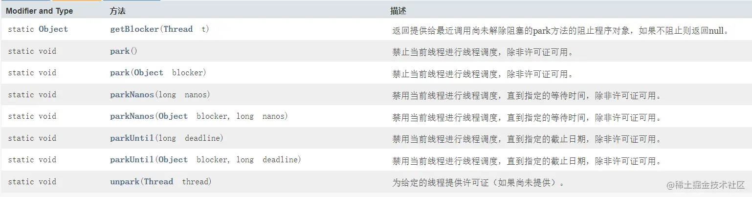 主要有如上的静态方法,常用的 park 和 unpark 需要承成对使用,类比于 Object 的 wait 和 notify 为一对。