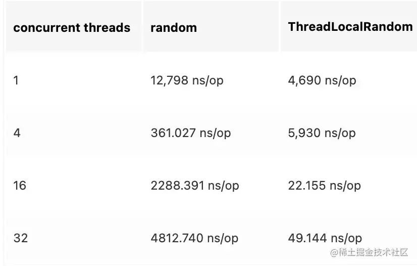 显而易见,无论线程数量是多少,ThreadLocalRandom性能是远高于Random。
