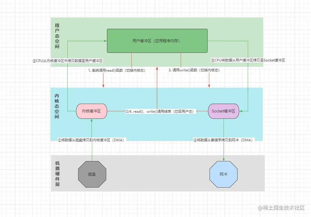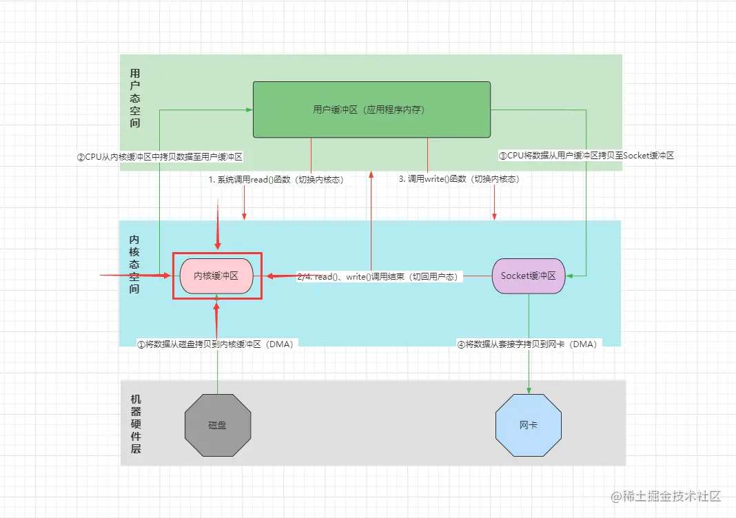 DMA传输数据完成后,CPU将数据从内核缓冲区拷贝至Socket缓冲区。 - ⑤