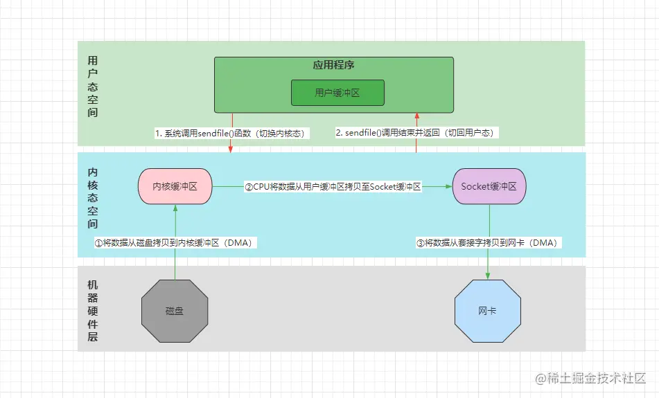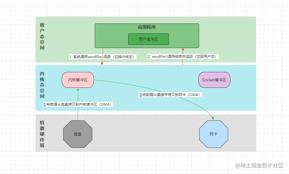 sendfile()调用结束,应用上下文切回用户态空间。 - ⑦