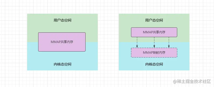 操作系统一般为了系统的安全性,在运行期间都会分为用户态和内核态,无法直接访问用户态程序内核态空间,所以Linux中的MMAP是基于虚拟内存实现的,而想要实现真正意义上的内存共享,这也就意味着需要重写内核结构,目前比较成熟的只有Solaris系统上的Fast Buffer技术,但大家只需了解即可,因为这个也很少用到。