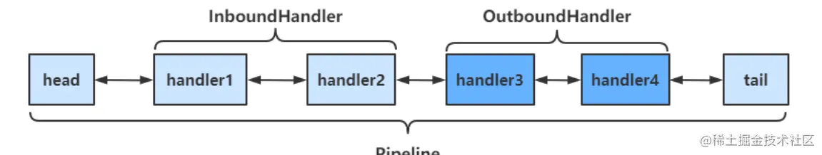 工序有多道,合在一起就是 pipeline(传递途径),pipeline 负责发布事件(读、读取完成…)传播给每个 handler, handler 对自己感兴趣的事件进行处理(重写了相应事件处理方法)