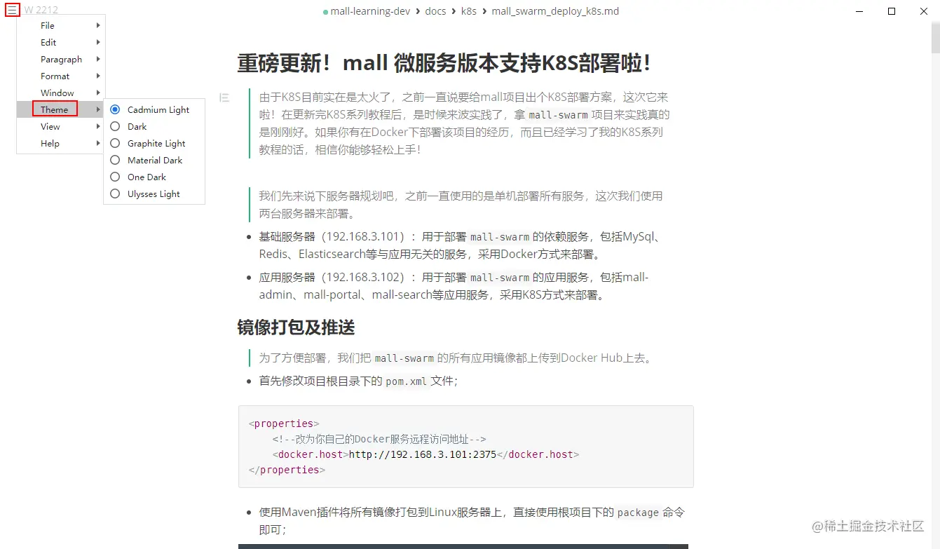 左上角按钮->Theme切换到深色主题,可以看到共支持6种主题;