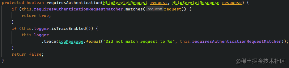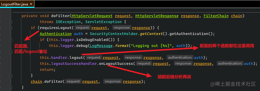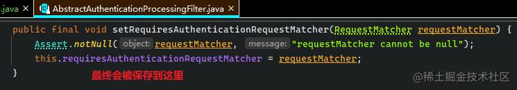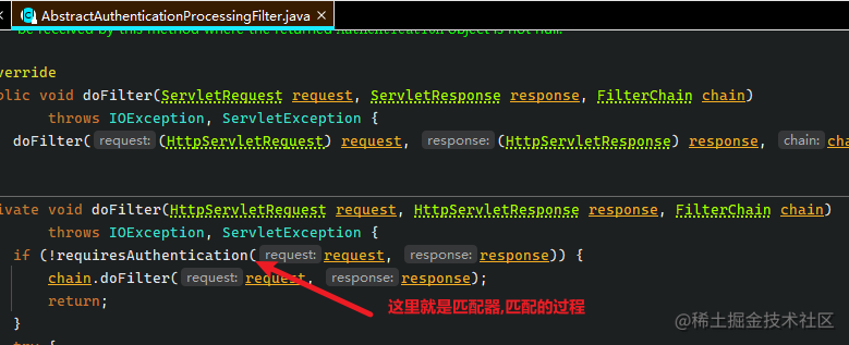 也就是说, 只要客户端请求了/doLogin, 就会被 AbstractAuthenticationProcessingFilter 过滤器匹配, 该过滤器就会拦截请求
