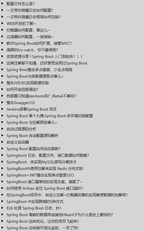 今天给大家分享的是阿里P8大佬整理的SpringBoot进阶笔记,含有60多篇精华文章,目录如下,建议大家认真看下目录,会发现很多是你们想要的。