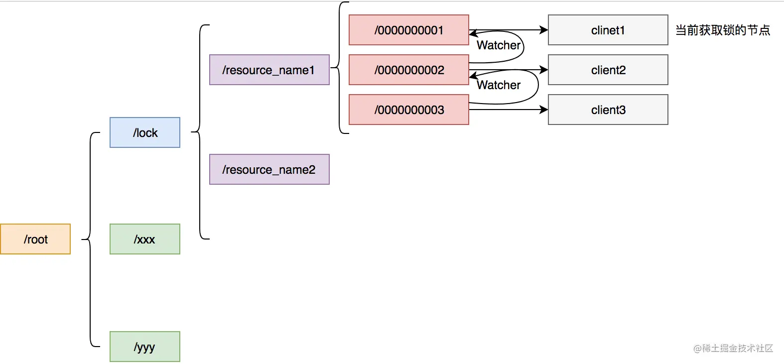 /lock是我们用于加锁的目录,/resource_name是我们锁定的资源,其下面的节点按照我们加锁的顺序排列。
