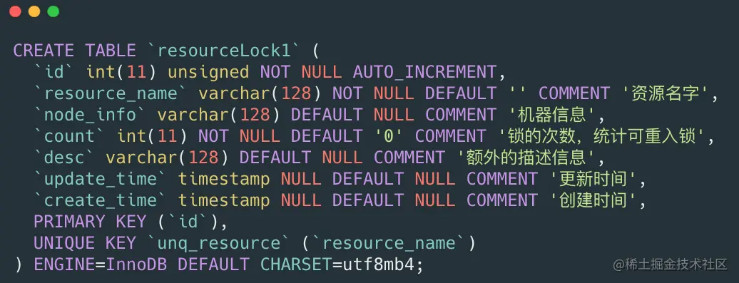 首先来说一下Mysql分布式锁的实现原理,相对来说这个比较容易理解,毕竟数据库和我们开发人员在平时的开发中息息相关。对于分布式锁我们可以创建一个锁表: