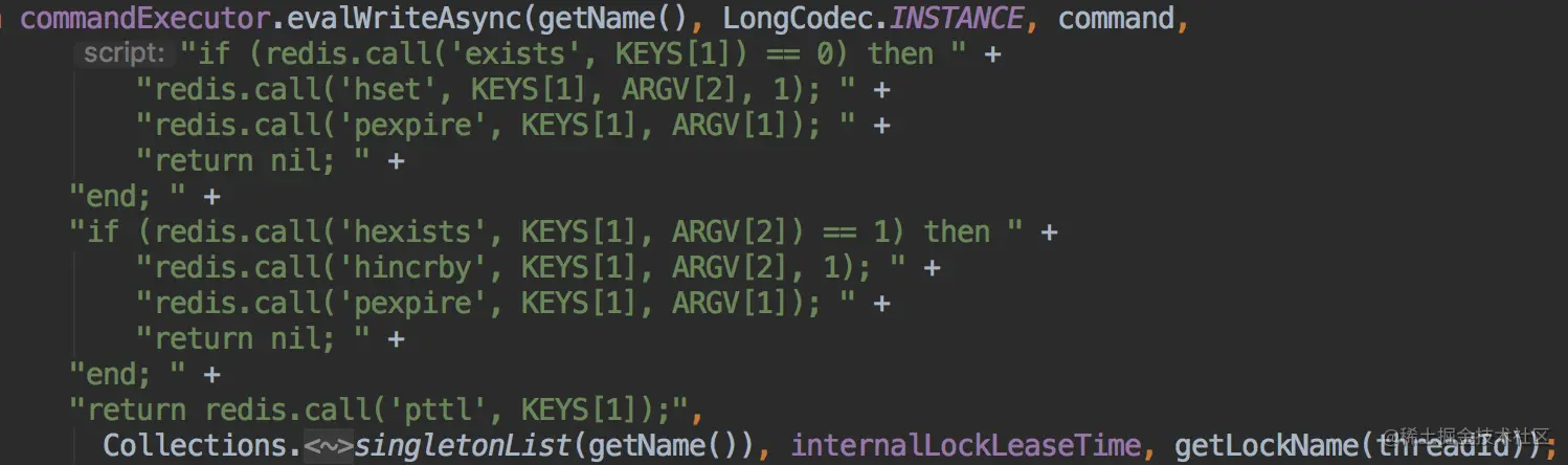 - 尝试加锁:首先会尝试进行加锁,由于保证操作是原子性,那么就只能使用lua脚本,相关的lua脚本如下: