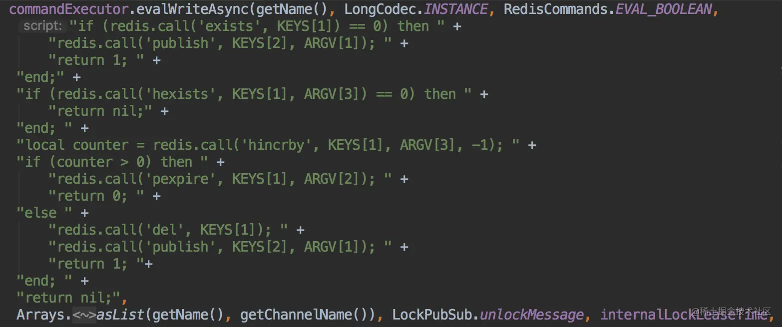 对于我们的unlock方法比较简单也是通过lua脚本进行解锁,如果是可重入锁,只是减1。如果是非加锁线程解锁,那么解锁失败。