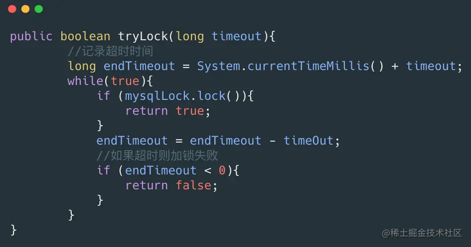 - 如果尝试加锁失败,判断是否超时,如果超时则返回false。