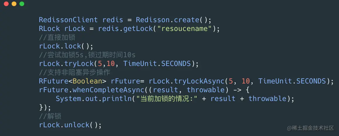 Redission封装了锁的实现,其继承了java.util.concurrent.locks.Lock的接口,让我们像操作我们的本地Lock一样去操作Redission的Lock,下面介绍一下其如何实现分布式锁。