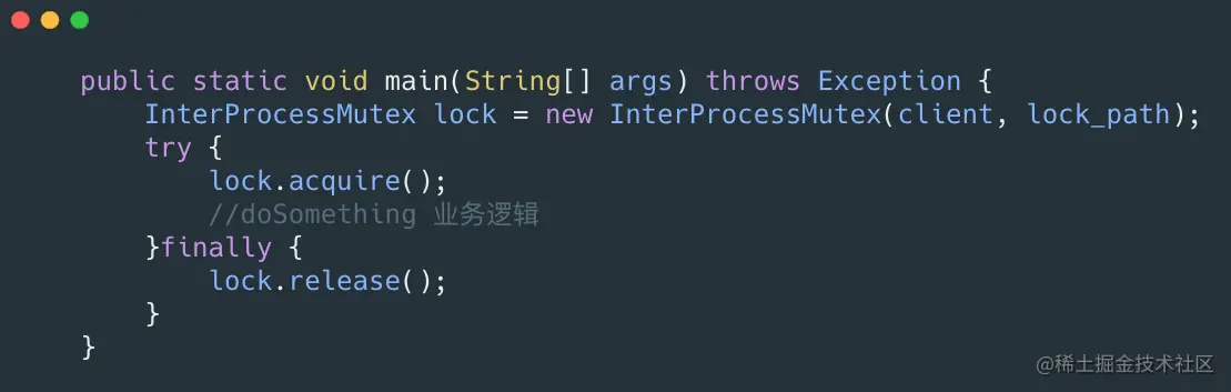 InterProcessMutex是Curator实现的可重入锁,我们可以通过下面的一段代码实现我们的可重入锁: