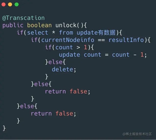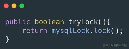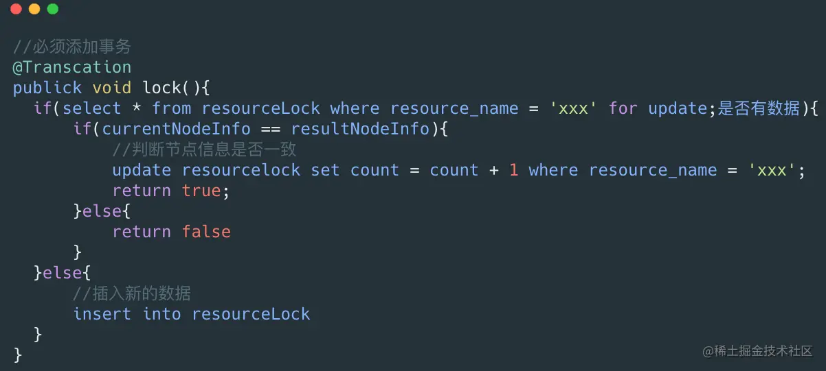 mysqlLock.lcok内部是一个sql,为了达到可重入锁的效果那么我们应该先进行查询,如果有值,那么需要比较node_info是否一致,这里的node_info可以用机器IP和线程名字来表示,如果一致那么就加可重入锁count的值,如果不一致那么就返回false。如果没有值那么直接插入一条数据。伪代码如下: