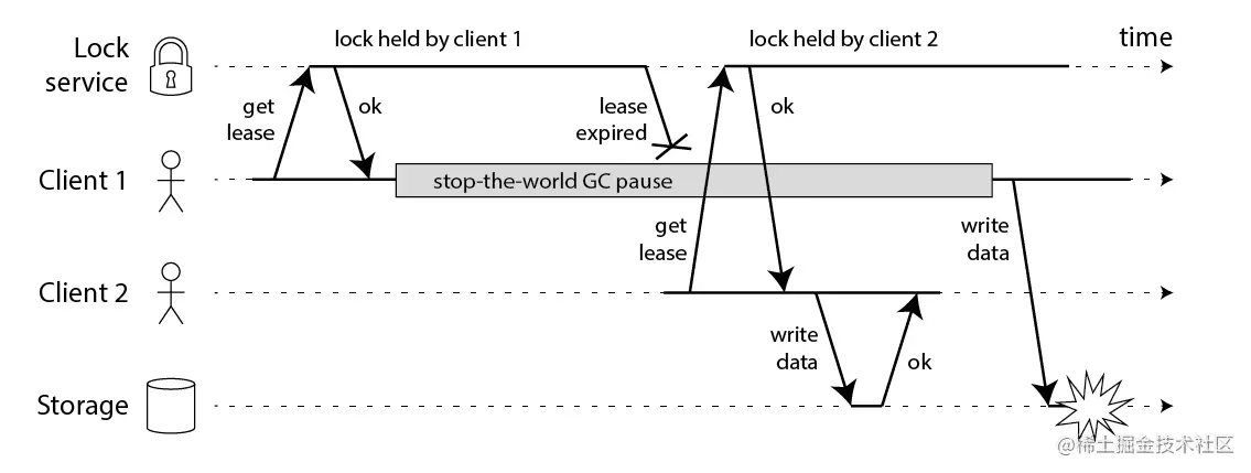 - 长时间的GC pause:熟悉Java的同学肯定对GC不陌生,在GC的时候会发生STW(stop-the-world),例如CMS垃圾回收器,他会有两个阶段进行STW防止引用继续进行变化。那么有可能会出现下面图(引用至Martin反驳Redlock的文章)中这个情况: