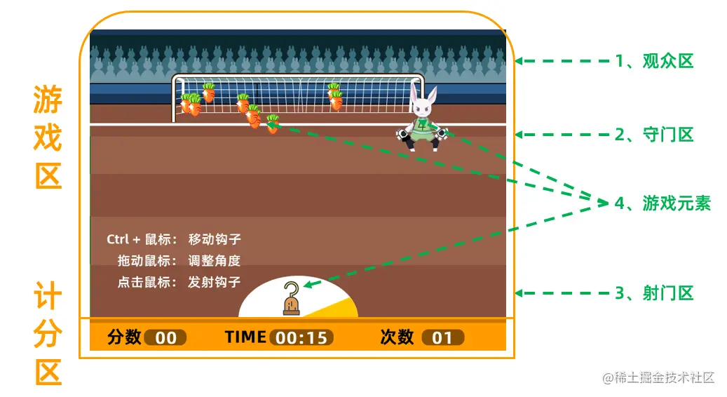 导读 | 世界杯虽已闭幕,但其带给我们的精彩,仿佛就在昨天,想一想,还是有一种爽劲,不知道大家是否也这样?转眼就到了2023年,今年是兔年,于是勇哥又造、造、造了一个小游戏《2023—兔兔保卫萝卜战》。该游戏结合了足球+兔子的元素,使用钩子去抢兔子的胡萝卜,同时抢到的胡萝卜带有吉祥的话,非常有意思。本文先通过代码实现游戏主体界面的绘制实现基础的游戏场景,而后阐述各类常见逻辑的实现方法。想了解Java如何开发游戏?想了解类似愤怒的小鸟中瞄准功能怎么实现?**想了解游戏各种复杂操作逻辑怎么实现?游戏开发中是否所有场景都只能通过加载素材资源实现?读完本文,相信你会有一定的收获,并掌握一定游戏开发实操方法。