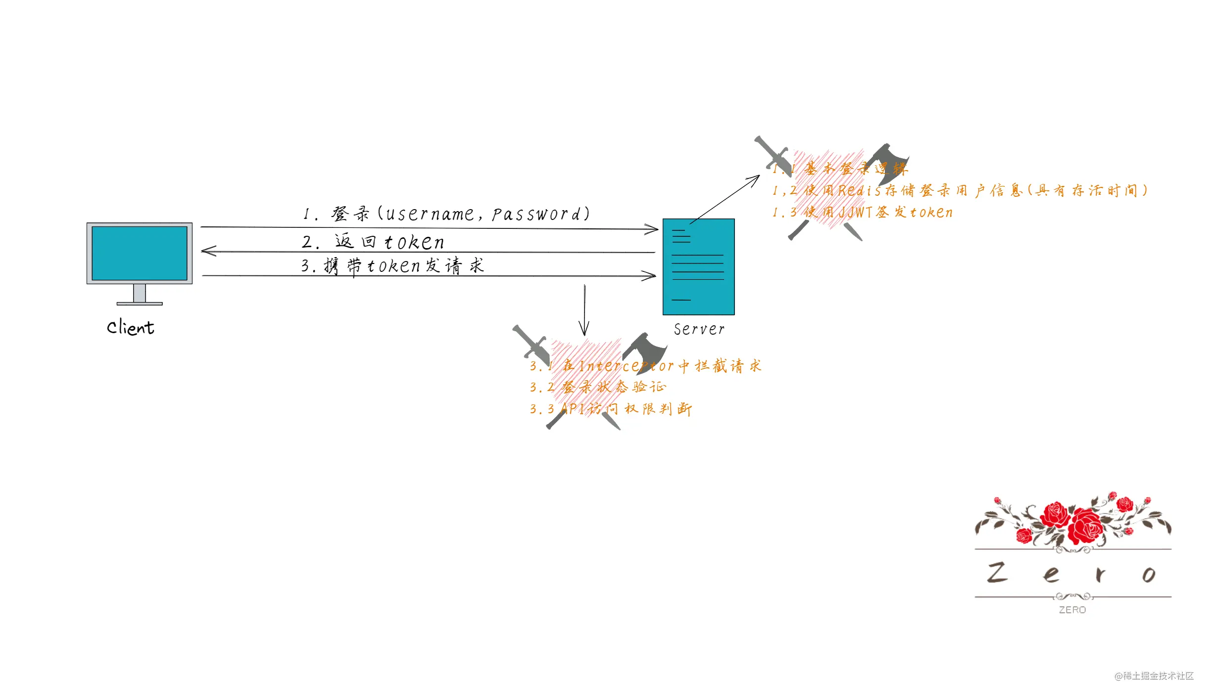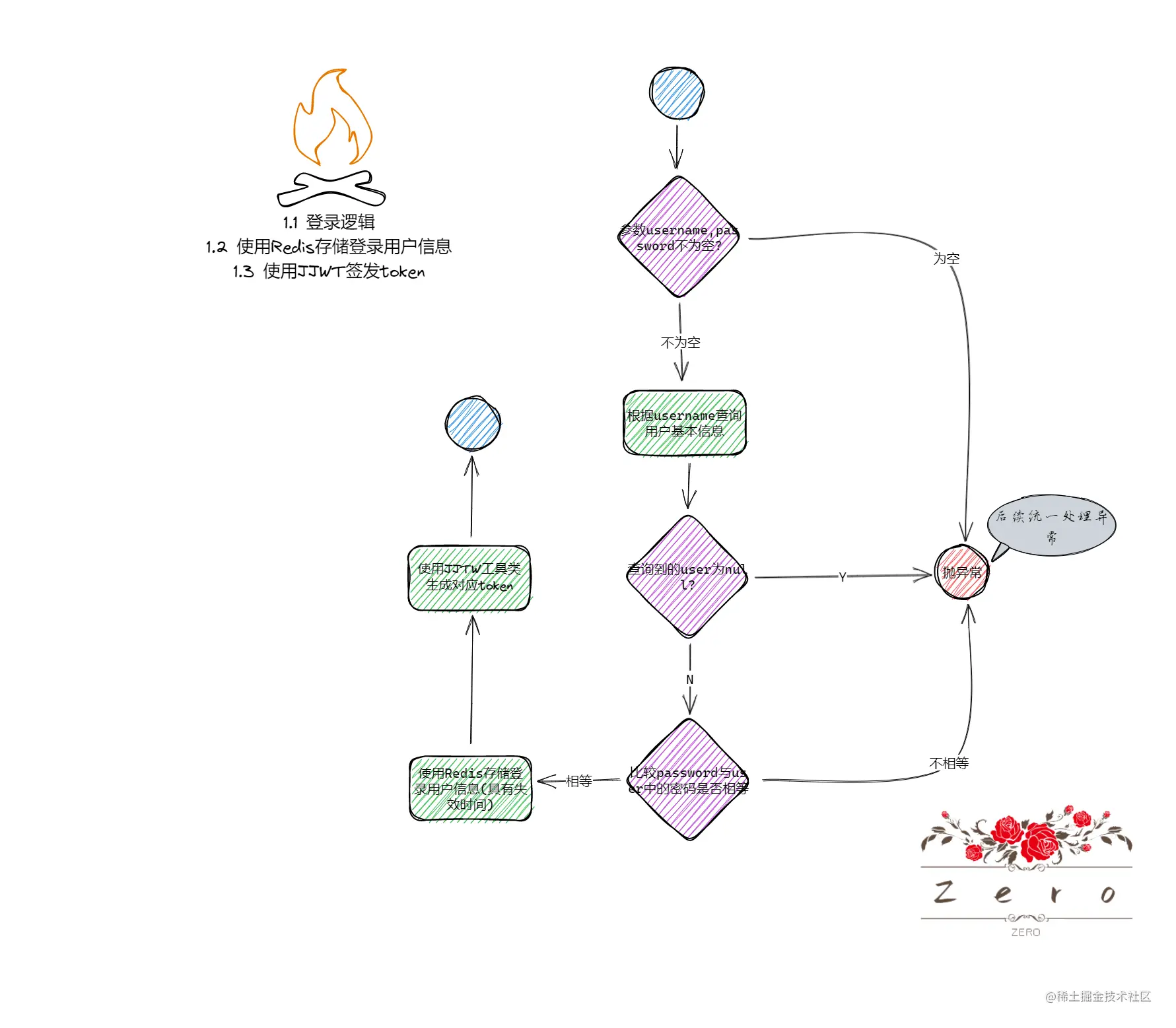 @RestController @RequestMapping("/login") public class LoginController { @Resource private UserService userService; @Resource private JwtUtils jwtUtils; @Resource private RedisTemplate<String, Object> redisTemplate; @Value("${redis.user.prefix}") private String redisKeyPrefix; @Value("${jwt.config.ttl}") private Long time = 1800L; @PostMapping public Result login(String username, String password) throws CommonException { if(StringUtils.isEmpty(username) || StringUtils.isEmpty(password)){ throw new CommonException(ResultCode.REQUEST_PARARMETER_MISS); } User user = userService.findByUsername(username); if(user == null){ // 不存在此用户,登录失败 return new Result(ResultCode.USERNAME_PASSWORD_ERROR); }else{ // 比对密码 if(password.equals(user.getPassword())){ // 登录成功,存储当前用户到Redis里(设置存活时间) 签发token redisTemplate.opsForValue().set(redisKeyPrefix + user.getId(), user, time, TimeUnit.SECONDS); String token = jwtUtils.createJwt(user.getId(), user.getUsername(), null); return Result.SUCCESS(token); }else{ // 密码错误 return new Result(ResultCode.USERNAME_PASSWORD_ERROR); } } } } 复制代码- 这里的登录逻辑是按照上述的逻辑图来实现的