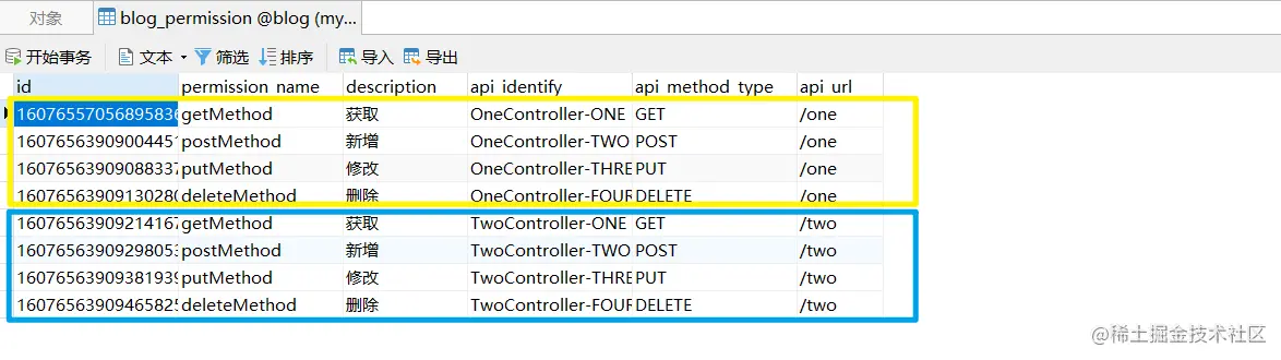 本Demo中权限表中的具体数据如下图所示(特别注意每行记录中的