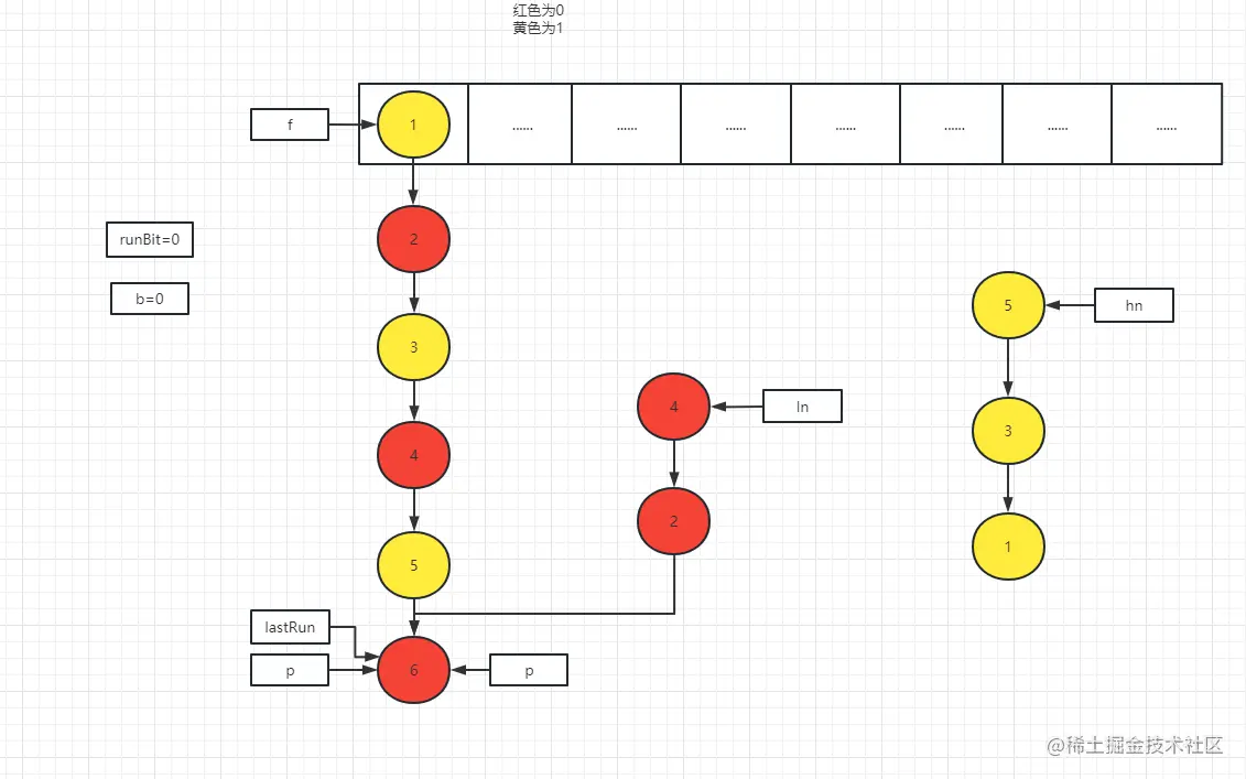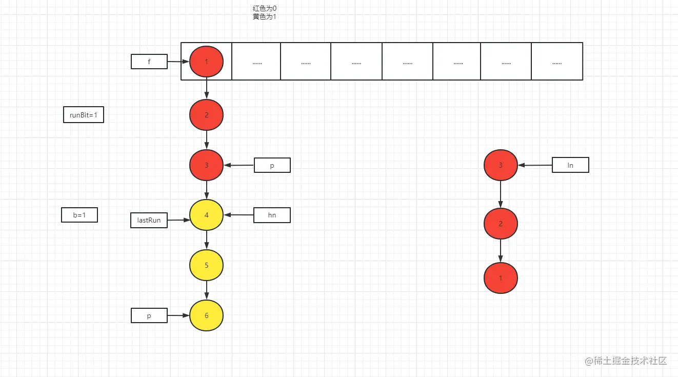 转移链表节点:链表节点会被分为高位节点链表(hn)和低位节点链表(ln),首先通过头节点的hash值与旧数组的长度进行与运算,与运算后的结果分为0和1,0则将节点放置到低位,1将该节点放置到高位,然后遍历整个链表来决定从那个节点开始以及后续的节点都是没有必要重新创建的,而是直接使用指针指向旧数组中的节点,lastRun指针指向的节点以及后续的节点都是没有必要创建的,因为你后续的链表节点没有被拆分为高位或低位,是一个连续存放在高位或低位的链表节点,所以说不需要重新创建节点,比如说一个链表中的所有节点都是放在低位节点中的,那lastRun指针指向的就是链表的头节点,该链表中的节点并没有改动,并不需要重新创建节点,而是直接将链表中的头节点放置到新的数组中即可,当区分了哪些节点是不需要重新创建的,则会将不需要重新创建的节点的头节点lastRun赋值给高位或低位,然后从链表的头节点开始遍历将需要创建的节点进行创建并添加到高位链表或低位链表中,在添加到高位链表或低位链表的时候,节点使用的是头插法,创建完成之后,低位节点链表会放置到新数组中所在的索引位置与节点在旧数组中所在的索引位置相同,高位节点链表会放置到新数组中所在的索引位置是节点在旧数组中所在的索引位置加上旧数组的长度,当高低位节点链表都转移完成之后则会在旧数组中该索引位置上添加到一个占位节点。