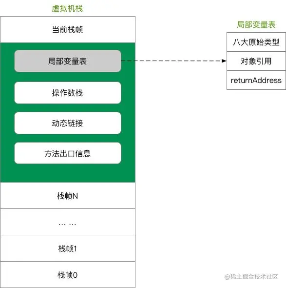 定义为一个数字数组,主要用于存储方法参数、定义在方法体内部的局部变量,数据类型包括各类基本数据类型,对象引用,以及 return address 类型。