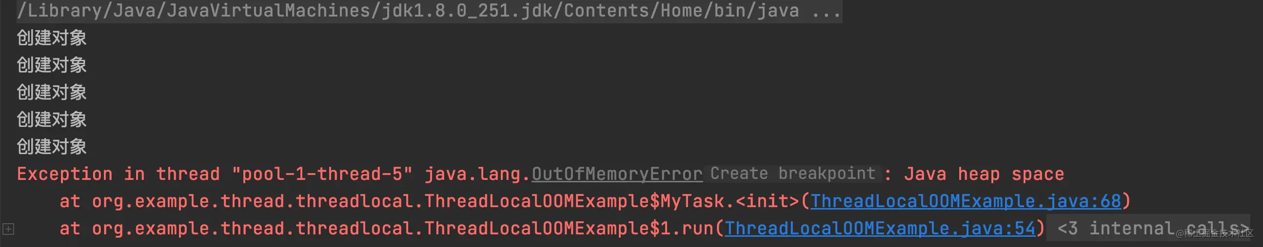配置完 Idea 之后,接下来我们来实现一下业务代码。在代码中我们会创建一个大对象,这个对象中会有一个 10m 大的数组,然后我们将这个大对象存储在 ThreadLocal 中,再使用线程池执行大于 5 次添加任务,因为设置了最大运行内存是 50m,所以理想的情况是执行 5 次添加操作之后,就会出现内存溢出的问题,实现代码如下: