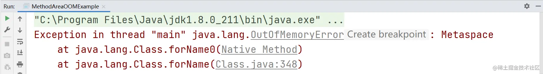 方法区是存在 OOM 情况的,比如在 JDK 1.8 中,如果元空间设置空间过小,而类信息产生的过多就会产生 OOM,如下示例所示: