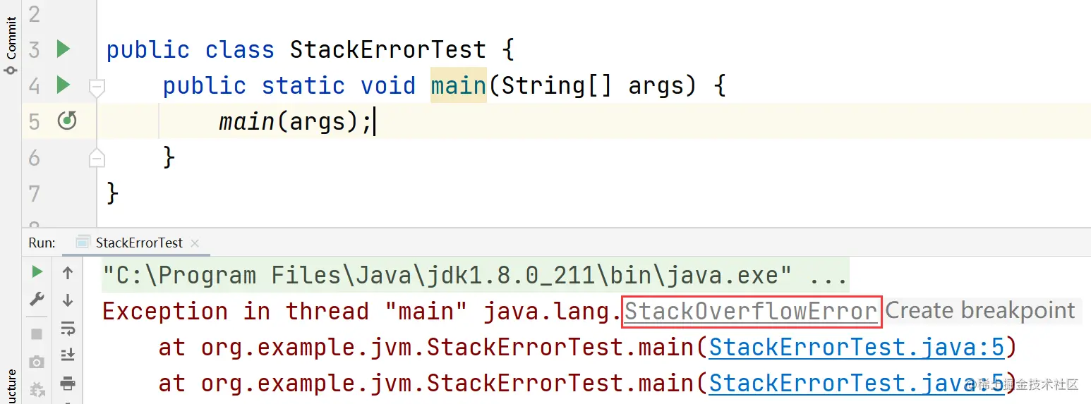 最简单的错误示例就是死循环,方法自己调自己,这样 Java 虚拟机栈就会只入栈不出栈,当到达 Java 虚拟机栈的最大数之后就会出现 StackOverflowError 异常,如下图所示: