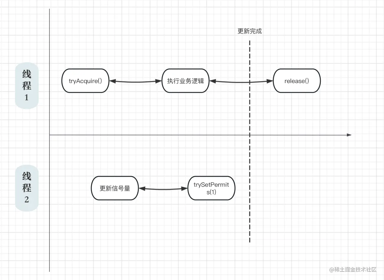 不过,问题似乎也不是很大?如果我保证业务在拿到信号后一定会在finally{..}中释放掉,并且semaphore.trySetPermits(1);这个方法只初始化一次,并且一定是单线程,那其实就没有问题。