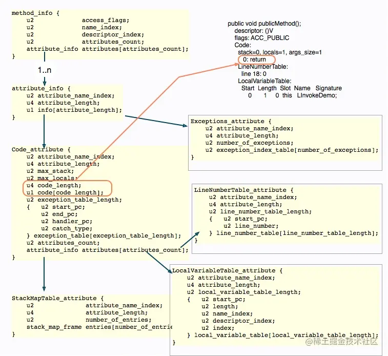 如下图,展示了一个简单方法的字节码描述,我们可以看到真正的执行指令在整个文件结构中的具体位置。