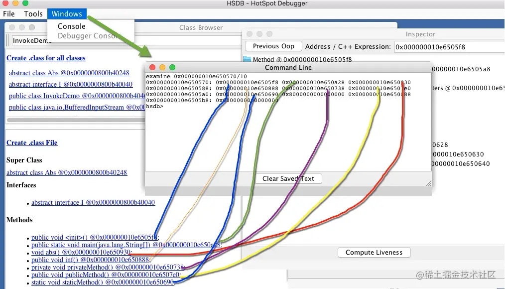 接下来可以使用命令行来检查这个数组里面的值。打开菜单中Console,然后输入examine命令。可以看到这个数组里的内容,对应的地址就是Class视图中的方法地址。