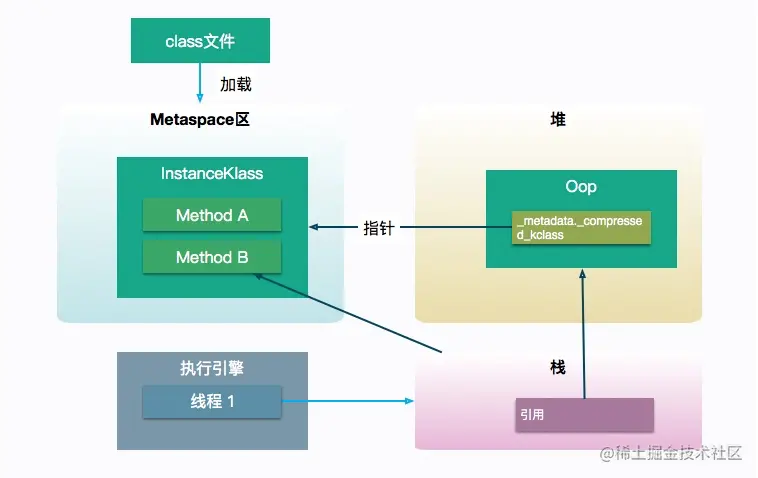 由以上的这些分析,我们可以得出下面这张图。执行引擎想要运行某个对象的方法,需要先在栈上找到这个对象的引用,然后再通过的对象的指针,找到相应的方法字节码。