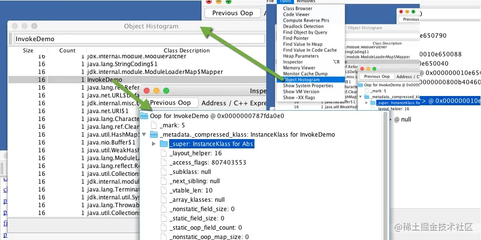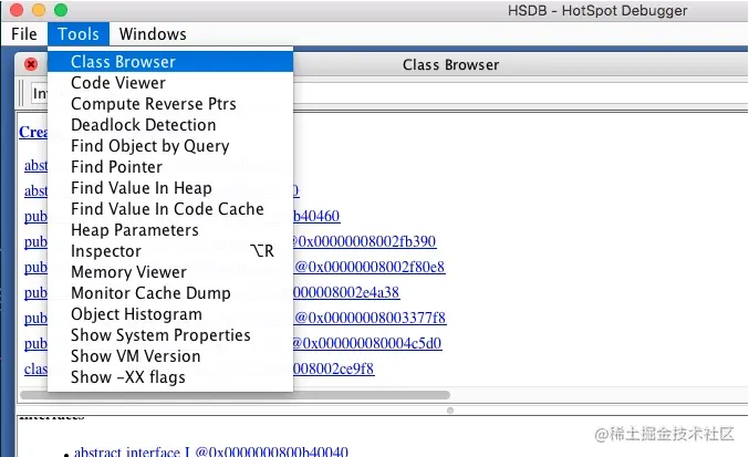 为了更加明显的看到这个过程,下面介绍一下 jhsdb 这个工具,这是在 Java9 之后 JDK 先加入的调试工具,我们可以在命令行使用 jhsdb hsdb 来启动它。注意,要加载相应的进程时,必须确保是同一个版本的应用进程,否则会产生报错。