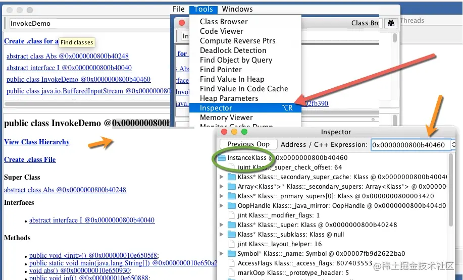 相比较起来,对象就简单的,它只需要保存一个到达Class对象的指针即可。我们需要先从对象视图进入,然后找到它,一步步进入Inspect视图。