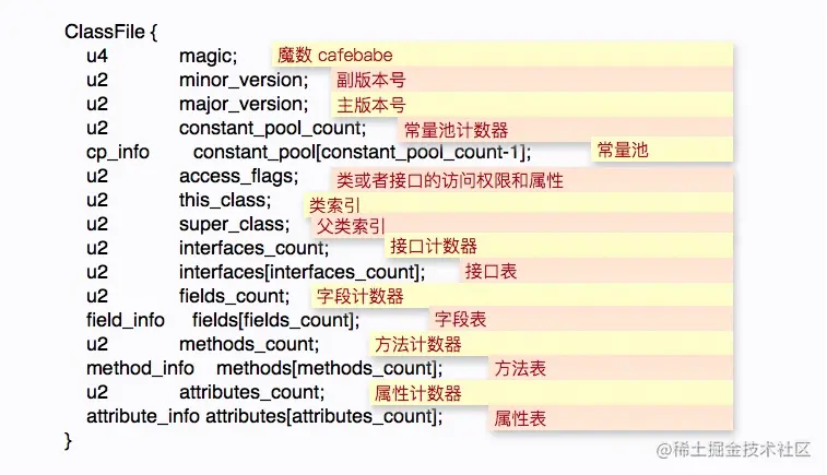 上图是class文件基本内容。这部分内容枯燥乏味,关于它的细节在Java的官方都能非常容易的找到。
